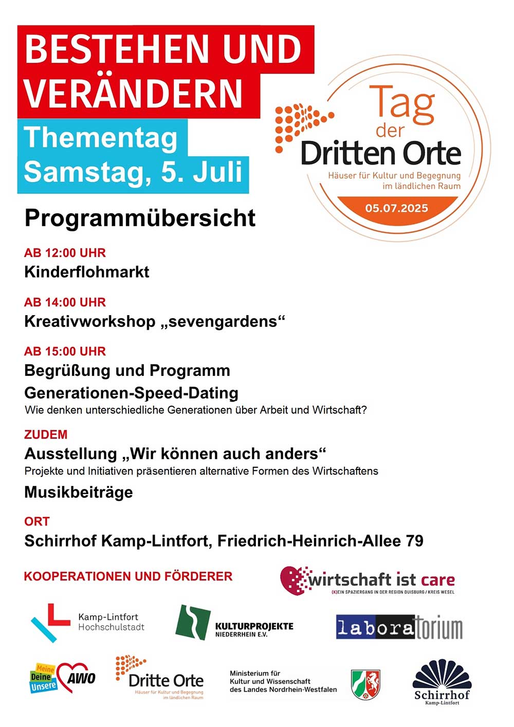 Seit Februar 2021 hat der "Pferdestall" im Schirrhof die Förderzusage für das Programm "Dritte Orte" des Ministeriums für Kultur und Wissenschaft des Landes Nordrhein-Westfalen. Im Familien-, Kultur- und Bildungszentrum Schirrhof ist ein Ort der Begegnung entstanden, in dem viele verschiedene Menschen zusammenkommen. Die im Schirrhof ansässigen Gruppen bieten am 5. Juli gemeinsam mit weiteren Organisationen ein interessantes Programm für alle Altersklassen.